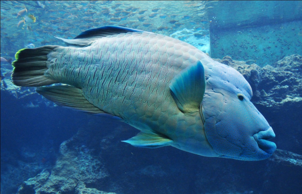 拿破仑是世界上最大的珊瑚礁鱼类,通体呈鲜艳的蓝绿色,上面布满了花纹,长着一对肥厚的大嘴唇。也是因为这对嘴唇,让它成了华人餐桌上的奢侈品,如今拿破仑已成了濒危的鱼类。