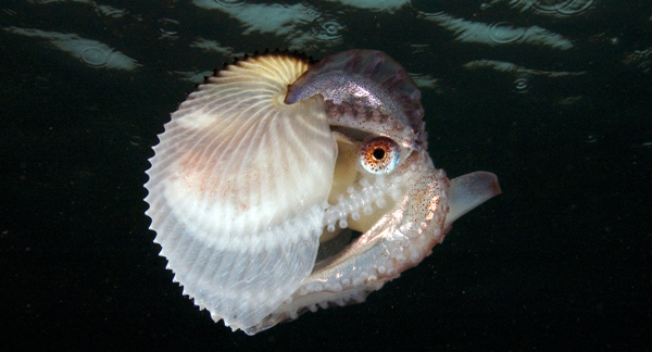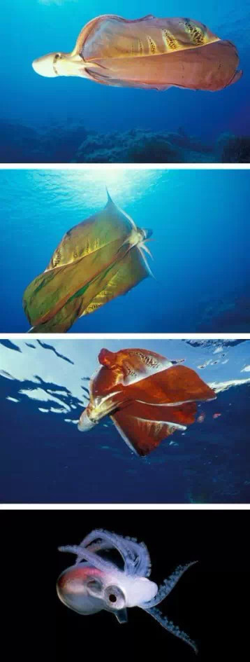 • 雌性纸鹦鹉螺章鱼是软体动物里非常独特的一种。他们的薄壳称为“纸鹦鹉螺”。他们从身体两侧网状结构打开这个壳。看起来像隐藏起来的号角,可以让雌性包住它们的卵。由于长度一般比雌性自己的身长长出许多,有时就完全把自己包在号角里。