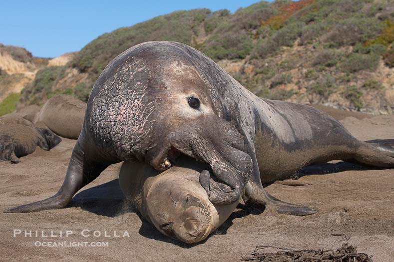 当然,面临危险的并不仅仅是幼仔,除此之外还有雌海豹。交配过程中,雄性南方象豹经常用颚部碾压雌性的头骨,在雄性僧海豹达到高潮时,雌性经常为它们的兴奋付出生命代价。实际上,为了防止一些海豹种群因暴力的交配行为走向灭绝,一个最简单的方式就是使用抑制性欲的药物。