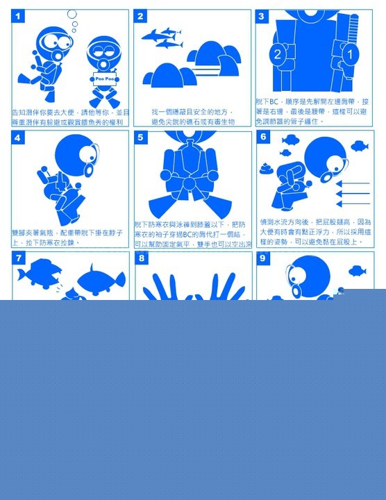 水中便便技巧,更是潜水圈中一项传说的密技,甚至许多潜水老前辈觉得,要通过这一项的试炼,才能称为潜水达人。仿若练就北冥神功,功力深远。不过这一个技巧没有传说中的那么神秘,人生在几百支或几千支的潜水中,难免会遇到一、两次在水中肚子不舒服,挡也挡不住的状况。这时候就是使出水中便便绝招的时候,为了潜友们的健康着想,所以特别公开这一项失传绝学,除了心法,再加以图解,希望对潜友们有所帮助,只是记住!不到最后关头,绝不轻言出招,因为这一招实在是威力太强大,一出招非死即伤,不得不谨慎啊!