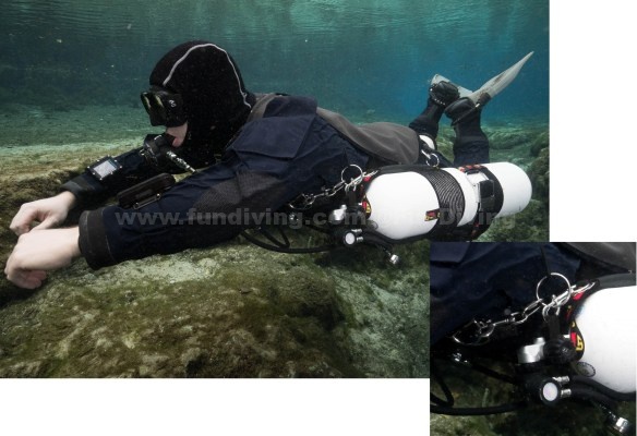 - 透过适当的环形绳调整,气瓶可以维持更贴身,更流线型 – 特别是对胸型轻薄的潜水员。这能產生较少的水阻,在水中保持流线型,并且减少对脆弱环境的伤害。