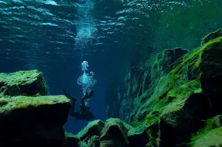 在这里,即使没有阳光,水底仍出奇地色彩鲜明,夹在两大板块中间,左边是北美洲、右边是欧洲,没有珊瑚和热带鱼,眼前只看见鲜绿色的海草,水清得连百米以外的东西都看得到,如果没有升空的气泡,还以为自己在太空漫步。