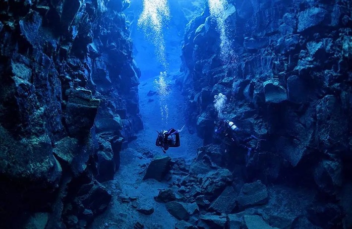 Silfra正是这样一个地处欧洲和美洲交界的大裂谷,潜入被海水掩盖的板块裂缝中,可以目睹大教堂般的裂隙形状,还有分隔地球地壳的缝隙。
