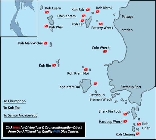 附近的群岛是由远离芭堤雅海滩五至七公里的三个小岛组成的。它们分别是 Koh Sak, Koh Larn 和 Koh Khrok 。虽然这个群岛是该地区密度最大的潜水地点,但是我们能看到在过去的三年多来,在能见度和软珊瑚的生长方面有显著的改进。在最近的几年里这个地区也成为了海龟的滋生地,在每个潜水地点都能看到它们。这里几乎没有大的浮游生物,所以潜水者不需要担心会跟鲨鱼有面对面的机会。