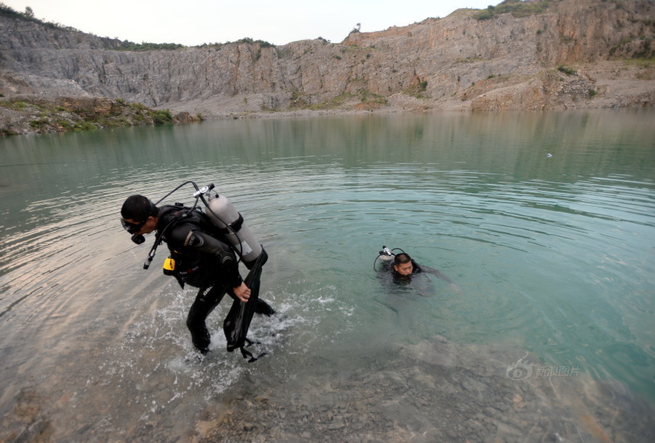 两位蛙人正在某矿山的水坑进行训练。