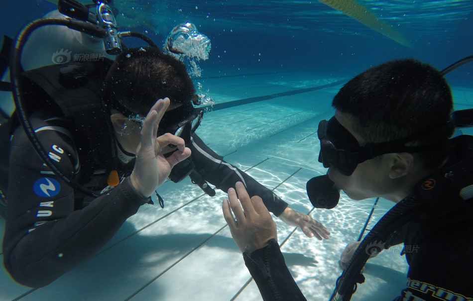 蛙人正在进行水下手势的训练。