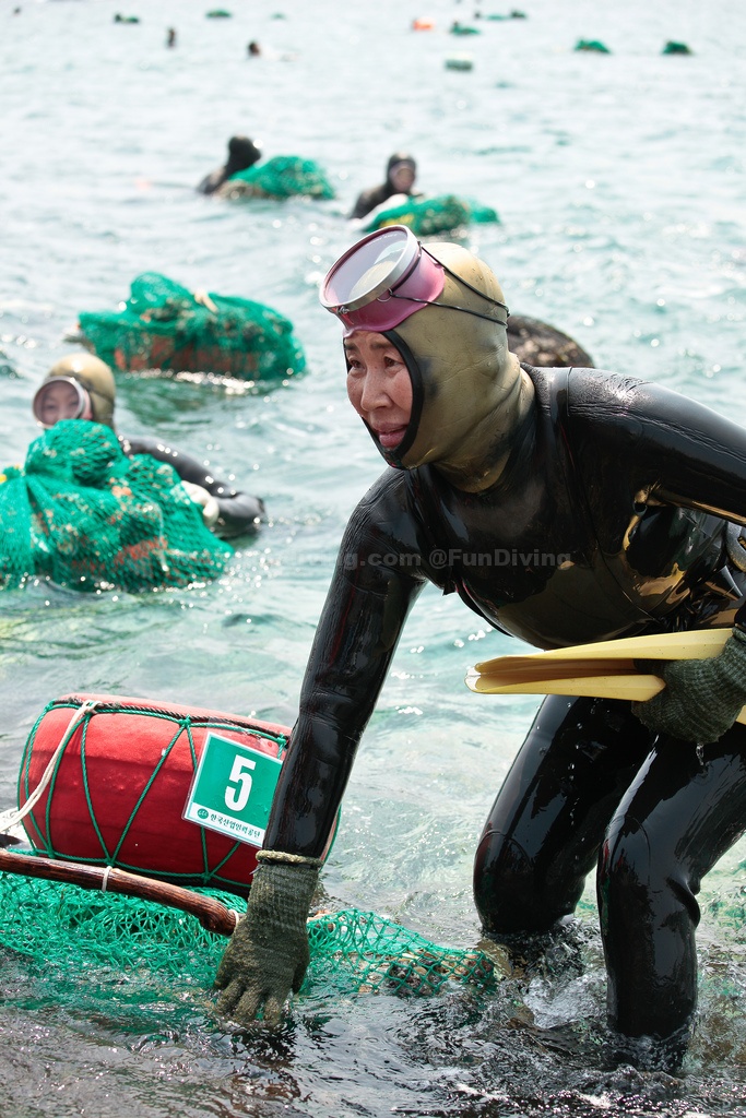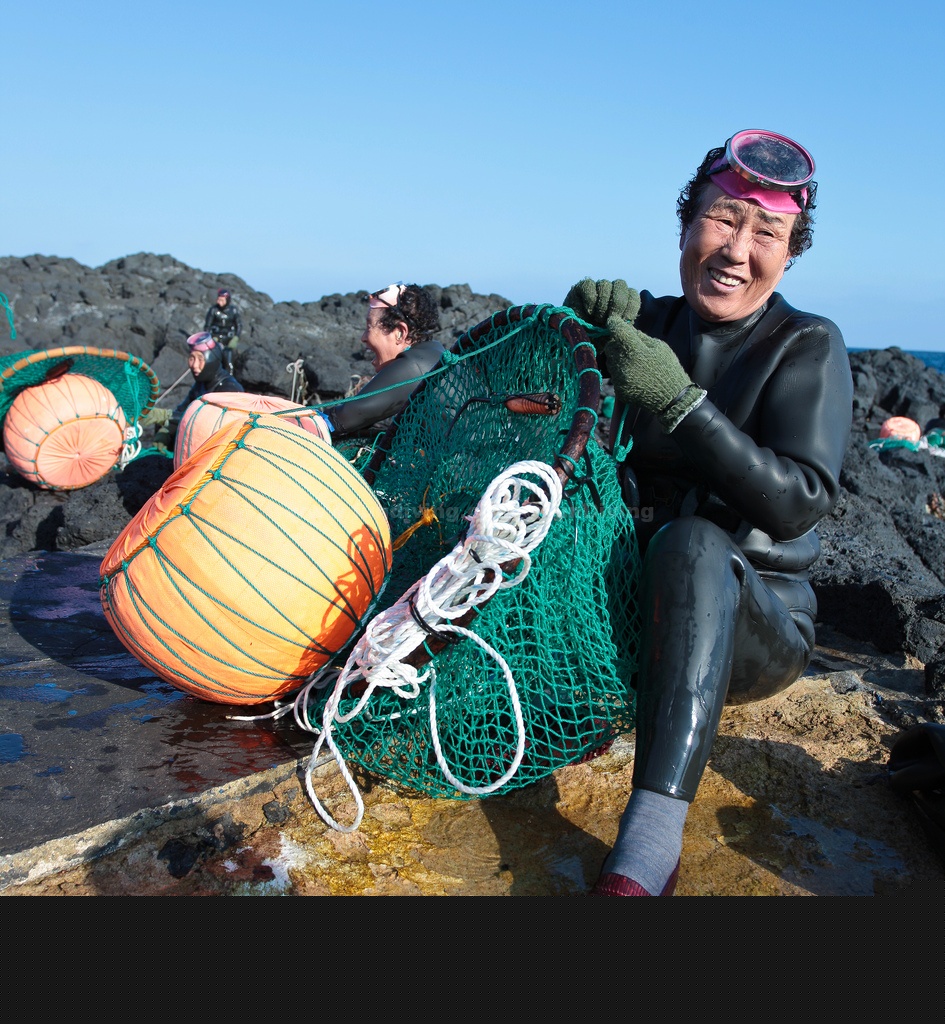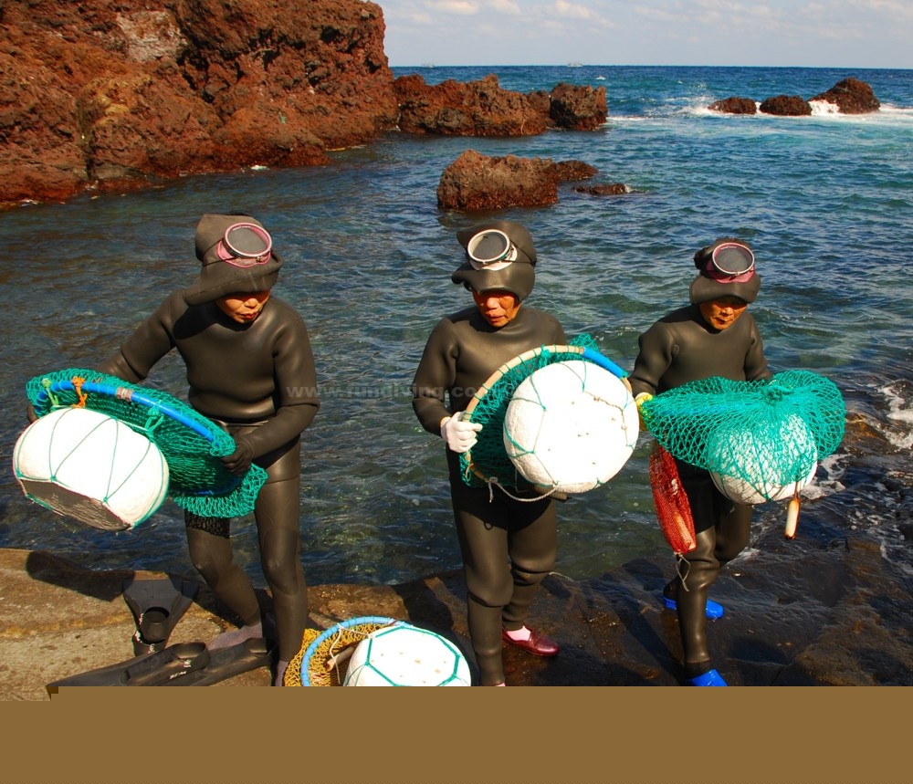 韩国海女她们潜入海中时,仅需蛙镜、可承受身体重量的泳圈或浮力球、收集捕获物的网袋与采挖器具。在韩国济州岛,你经常会在海边看到她们:黝黑的皮肤,长发盘在头顶,身穿黑色的紧身潜水衣,背着色彩鲜艳的背囊,一个猛子扎进海里。她们就是海女,通常也是这一带村落里最富有,地位最高的女人。为保护海洋生物,韩国政府对盈利性潜水有严格的规定,海女必须徒手潜水。法定装备只有一副面镜和一身潜水衣,此外任何现代化器械均违法。21世纪之后仅有5000余人,绝大多数年龄也都超过50岁,年龄最大的91岁。为传承济州岛独特的海女渔业文化,韩国在济州海女抗日运动纪念公园内建立了海女博物馆。展出修复过的海女旧居、海女们的日常饮食与传统服装,所使用的器具,以及船舶、盐田等模型及珍贵照片等。同时展示的还有海女们参与抗日运动的历史文物。让人们了解海女的生活与工作形态,感受济州女性坚毅不屈的性格。