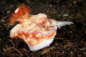 如果不是科学记录和突出背部的图案,切忌以高角度拍摄,这样的图片的可观性不高。有时可以单独拍摄它的尾部,通常海兔的尾部也是比较漂亮,也是一个很好的题材。