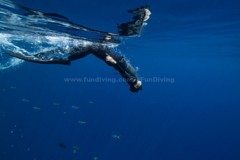 水肺潜水员在水下会不断呼出气泡,这在海豚和鲸鱼听起来非常吵闹,避而远之。而自由潜水员则经常有机会与海豚一起玩耍,与鲸鱼同游。由于不需要背负潜水装备,在水下拍摄人物的时候,戴着面镜和纤长脚蹼的自由潜水员,宛如一条人鱼,非常上镜。