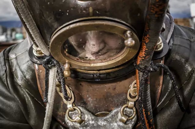 在穿好潜水衣后,这只沉重的铜质头盔将被用螺栓与衣服扣住。最后,头盔中央直径约为20厘米的视窗在下水之前也将被锁上以防进水。