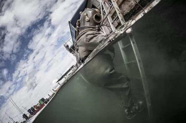 身穿这样一套潜服的下潜,可以被称作是“跳入”但似乎又不能这样界定。因为这巨型的潜服的下水及出水都必须借助梯子才可完成。