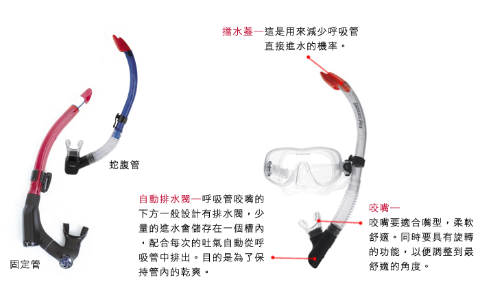 在潜水活动的时候,还是会有一段时间在水面上浮游或者是休息,这时候潜水员就可利用呼吸管直接呼吸大自然的新鲜空气而不须浪费气瓶中有限宝贵的空气,呼吸管必须搭配面镜一起使用。呼吸管有许多不同的选择,大致上可区分为固定管与蛇腹管二种型式。蛇腹管的设计是希望在使用调节器时不受到呼吸管的干扰。固定管式的呼吸管则应注意咬嘴的位置是否恰当,以及游动时的水阻。