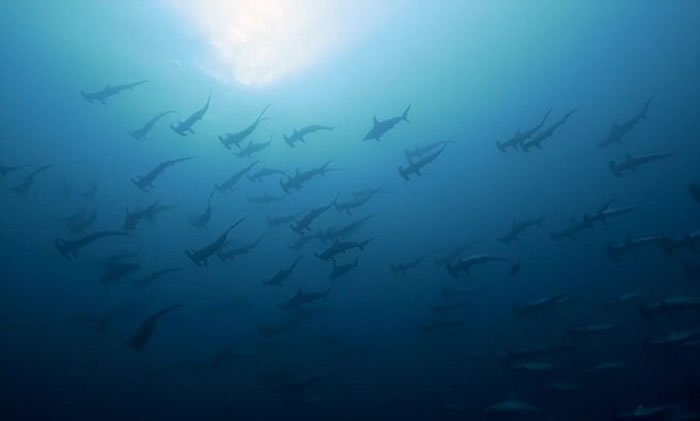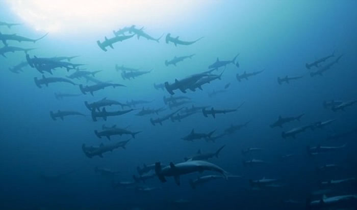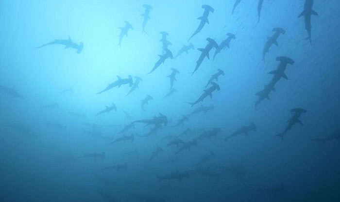 据悉,迁徙的锤头鲨多长达15英尺(约合4.5米),重达500公斤,是名副其实的大家伙。它们喜欢夜间单独捕食,攻击能力极强,但游客看见这场面宏大迁徙时,仍被它们的美丽所震撼,潜水员更是勇敢地靠近它们,记录下这美妙的时刻。