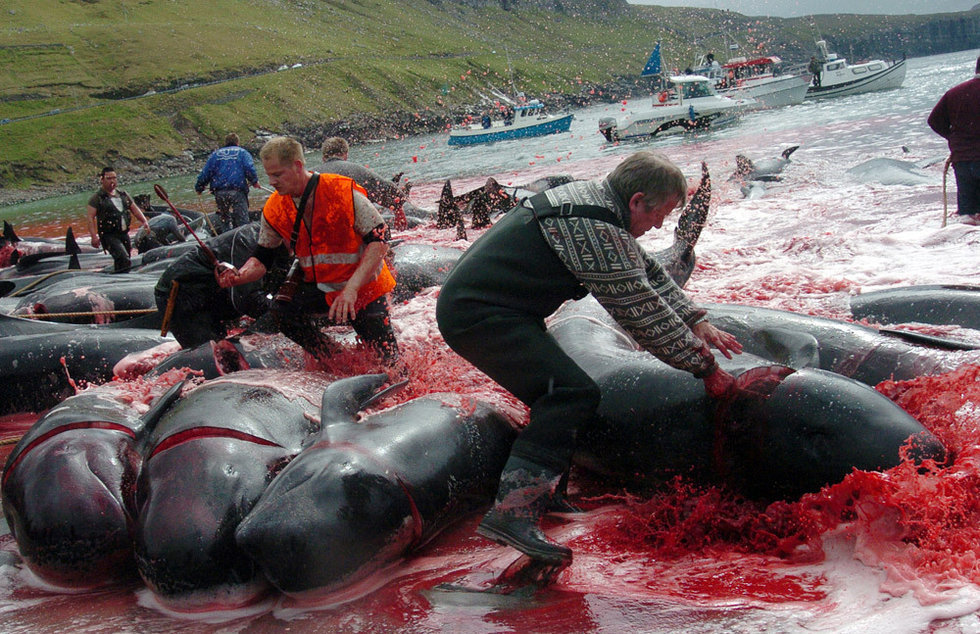 当地人将鲸鱼驱赶至海湾,然后集体屠杀它们。