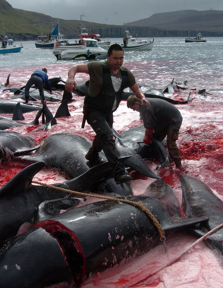 近日,丹麦海外自治领地法罗群岛,深蓝色的海水变成了红色。染红海岸线的不是别的,而是250头领航鲸的鲜血。媒体公布的照片显示,当地居民将鲸鱼赶到岸边,并用刀和鱼叉杀死他们,由于被杀死的鲸鱼数量众多,鲜血已经将整片海域染成红色,场面十分骇人。