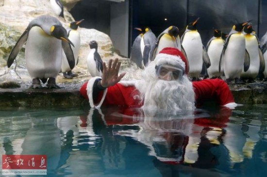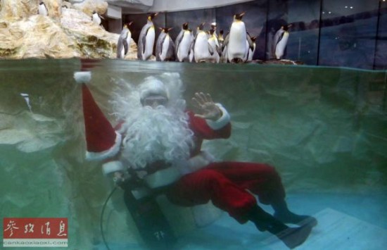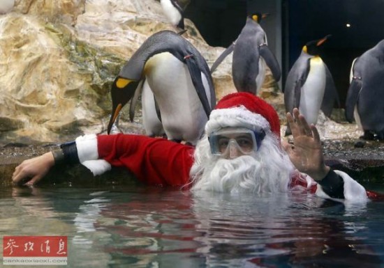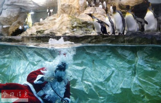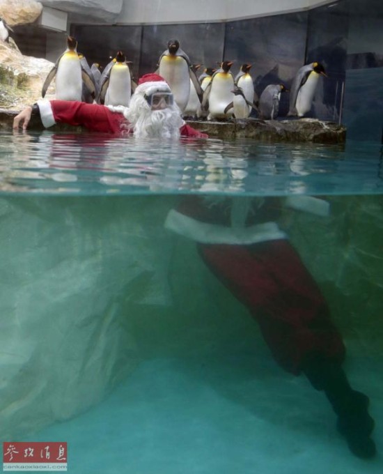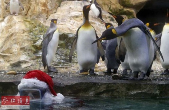 法国动物园”圣诞老人” 引呆萌企鹅观望,12月19日,法国昂蒂布,动物园内,一名潜水员身穿圣诞老人服饰,与帝企鹅玩耍。新闻来源:新浪军事