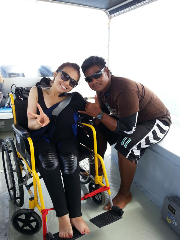不管有没有轮椅跟我下去海底,对我来讲其实都很困难,我会载浮载沉,头就往后栽,然后我就呛水。对大海的恐惧更大,因为我身无旁人,我觉得太可怕。跟潜水教练多次沟通后,他们细心地帮我穿戴潜水设备,教我使用面罩,调节器,扛着我潜入海底;最重要的是,他一直用平静但坚定的语气对我讲:不要怕,相信自己。