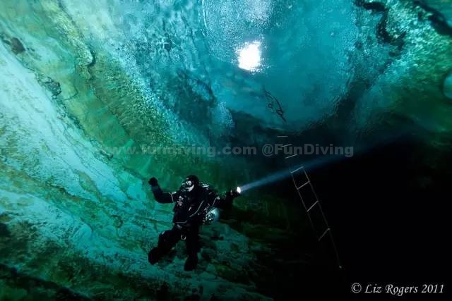 此处的水异常清澈,潜水者甚至看起来像是漂浮在空中而非水中。这片水域有着古老历史,蕴藏着许多化石,但是水下通道繁多,像迷宫一样,因而增加了其危险程度。