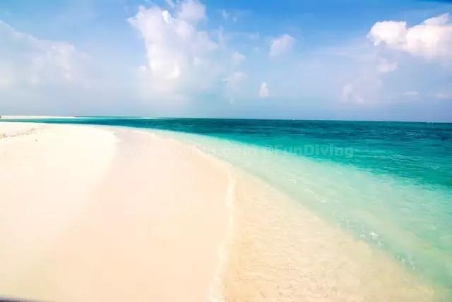 岛上全是细软的白色海沙,混着被吹打碎的红珊瑚粉末,水清沙幼。而这里的海水像钻石一样晶莹透亮,仅凭肉眼便能看到海底的景象。